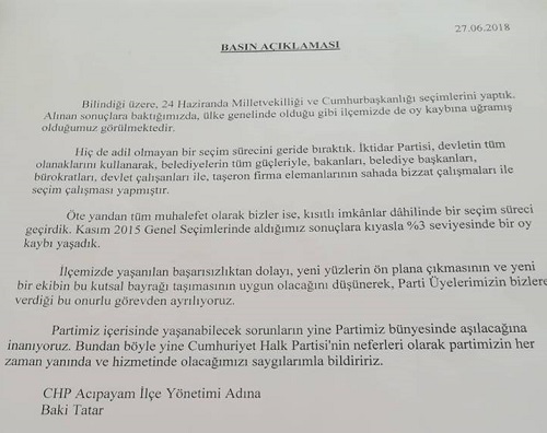 24 Haziran'da milletvekilliği ve Cumhurbaşkanlığı seçimlerinde daha önceki seçimlere göre ülke genelinde ve Acıpayam'da oy kaybına uğrandığı için parti yönetiminden istifa ettiklerini açıklayan İlçe Başkanı Baki Tatar yönetim kurulu adına bir basın açıklaması yayınladı.
