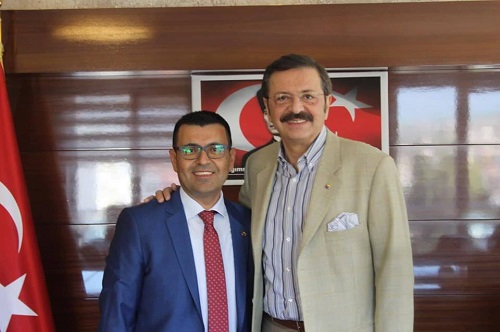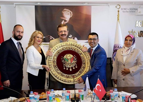 Acıpayam Ticaret Odası Başkanı Mehmet Sürücüoğlu ve Başkan Yardımcısı Şenay Arslan TOBB Başkanı Rifat Hisarcıklıoğlu’na ziyaretin anısına hediye takdim ettiler.