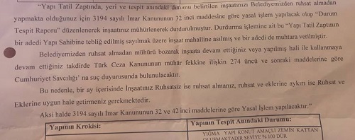 “Yapı Tatil Zaptında, yeri ve tespit anındaki durumu belirtilen inşaatınızı Belediyemizden ruhsat almadan yapmakta olduğunuz için 3194 sayılı İmar Kanununun 32 inci maddesine göre yasal işlem yapılacak olup “Durum Tespit Raporu” düzenlenerek inşaatınız mühürlenerek durdurulmuştur. Durdurma işlemine ait bu “Yapı Tatil Zaptının bir adedi Yapı Sahibine tebliğ edilmiş sayılmak üzere inşaat mahalline asılmış ve bir adedi de muhtara verilmiştir.
