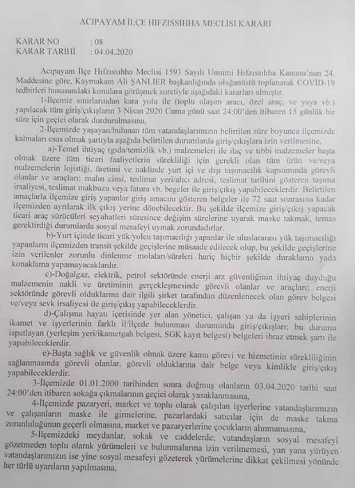 Tüm alınan önlem ve tedbirlerin yetersiz kalmasının ardından Acıpayam İlçe Umumi Hıfzıssıhha Meclisi Kararı ile içleye yapılacak olan tüm yaya ve araçlı giriş çıkışlar 15 günlüğüne durduruldu.