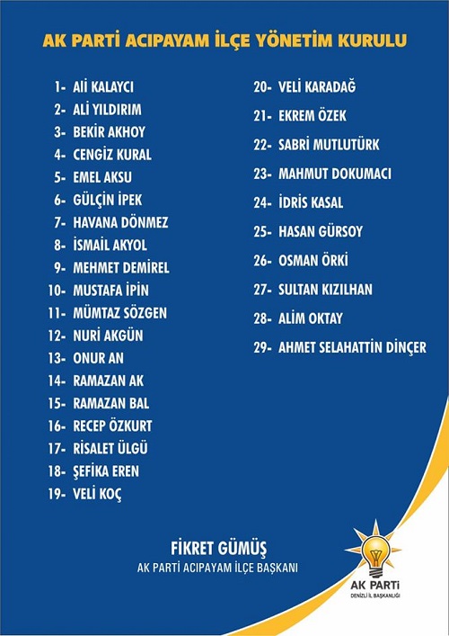 Adalet ve Kalkınma Partisi (AK Parti) Acıpayam İlçe Yönetim Kurulu Listesi Genel Merkez tarafından onaylandı.