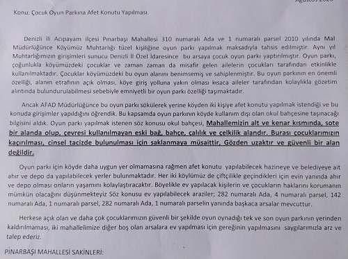 Pınarbaşı mahallesi halkı çocuk oyun parkının uzun yıllardan beri burada olduğunu ve yine yerinde kalmasını istediklerini belirttiler. Hazineye ait iken yaklaşık 10 yıldan beri çocuk parkı olduğunu aktaran mahalle halkı, Afet İşleri Müdürlüğünce bu oyun parkının yerine iki kişiye afet konutu yapılmak istediğini belirttiler ve oyun parkının yerinde kalmasını, konutlar için daha uygun yerlerin olduğunu ifade ettiler.