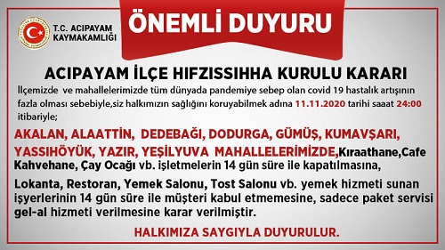 İlçe Hıfzısıhha Kurulu tarafından yapılan açıklamada “İlçemizde ve mahallelerimizde, tüm dünyada pandemiye sebep olan covid 19 hastalık artışının fazla olması sebebiyle, siz halkımızın sağlığını koruyabilmek adına 11.11.2020 tarihi saat 24.00 itibariyle,