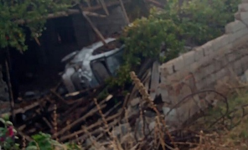 Kontrolden çıkan otomobil savrularak yol kenarındaki bir evin bahçesindeki depo olarak kullanılan yere düştü.