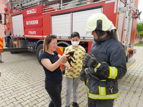 Acıpayam Aşağı Mahallede bir binanın çatı katında mahsur kalan kedinin sesini duyan vatandaşlar durumu itfaiyeye bildirdi.