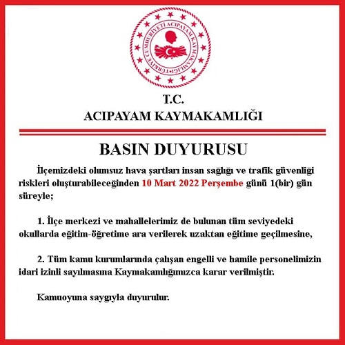 10 Mart 2022 Perşembe günü Acıpayam'da okulların bir gün tatil olduğu açıklandı.