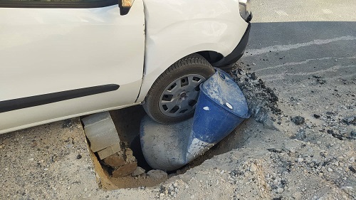 Kaza sonrası aracın ön kısmı çukura düşerken arka tekeri de askıda kaldı.