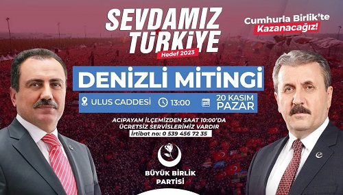 Büyük Birlik Partisi Genel Başkanı Mustafa Destici Pazar günü Denizli’de düzenlenecek mitinge katılarak vatandaşlara seslenecek.