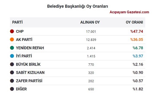 Acıpayam'da 31 Mart 2024 yerel seçimlerindeki oy dağılımları belli oldu. Gayriresmi sonuçlara göre.